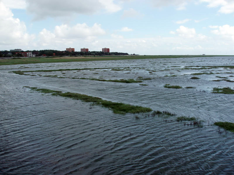 Była woda! Podpłynęła prawie do mojego pokoju (obok tych czerwonych wieżowców) i pod molo, po którym już spacerowałam „na sucho” nad łąkami.