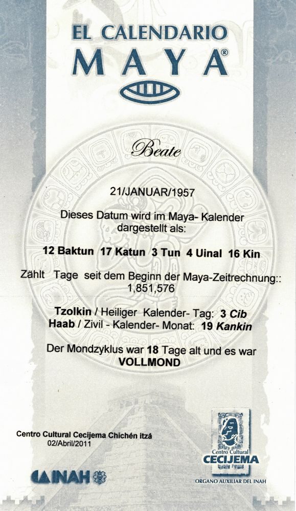 Pełna data składa się z połączenia nazwy w tsolkin i haab i powtarza się po 18980 dniach = po 52 latach.