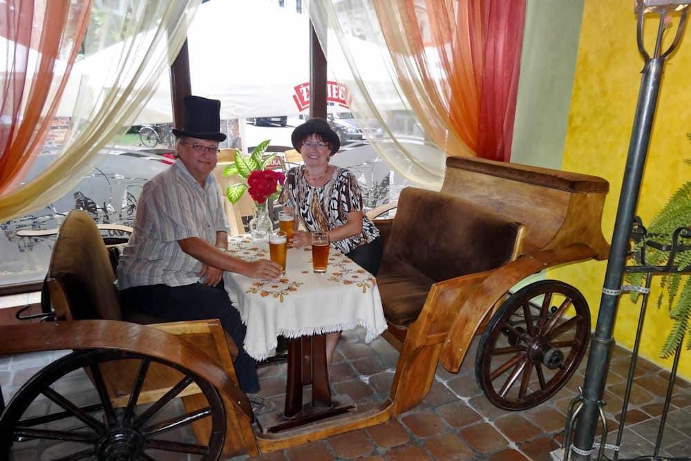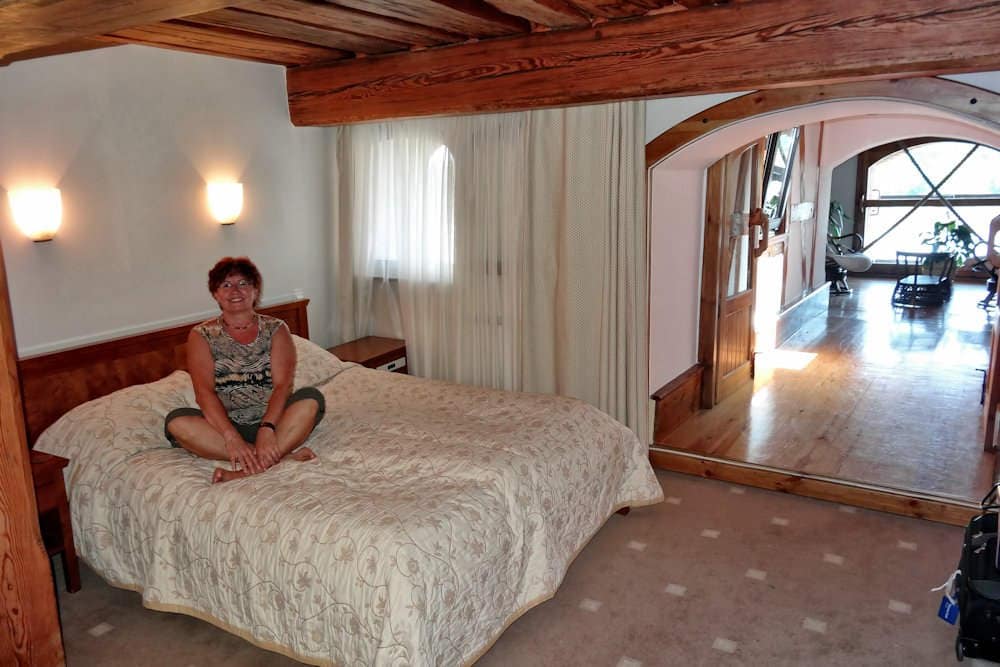 Takiego zwariowanego pokoju nie mieliśmy. Pomijając, że czujesz się jakby przeniesiony 300 lat wstecz – jest to dawny szwedzki spichrz z 1719 roku, ciemne niskie stropy, grube belki pod sufitem, stylowe urządzenie. W naszym pokoju ciągnął się dalszy korytarz do baszty z oknem na Wisłę, fotelami i linami połączonymi z żurawiem, który był nad naszym stolikiem i piętro wyżej. Tam siedziałam sobie wieczorami przy laptopie i patrzyłam na odbicie księżyca w pełni w Wiśle. Ten korytarz był dość niski, tak około pół głowy brakowało Jurkowi, więc musieliśmy się zawsze schylać.