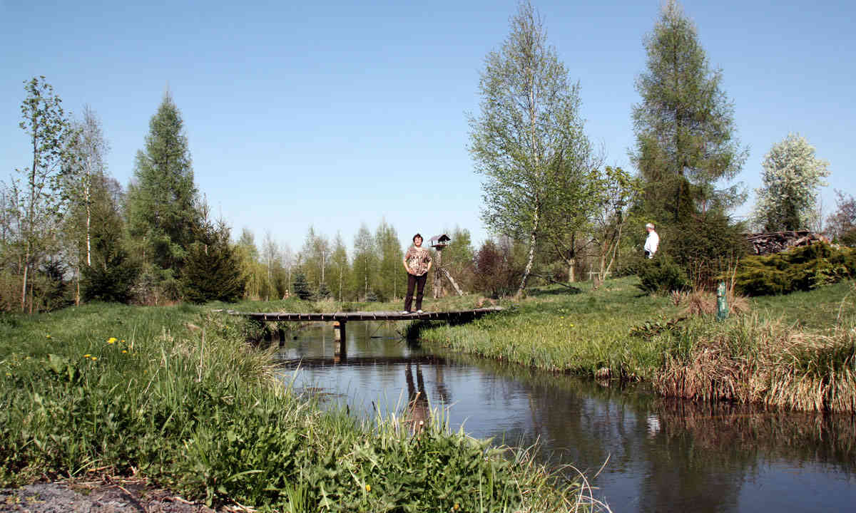 Dziś, na terenie dobrych 5 hektarów, stworzył jeden kuzyn mały raj, wykorzystując częściowo naturalny teren, wkładając wiele pracy i miłości do natury. Wśród lasów i mokradeł są stawy, strumyki, rzeczka, rozmaite wyszukane drzewa i rośliny. Urok tego miejsca szybko odkryły również różne ptaki i bobry, których żyją tam dziś 4 rodziny. Kuzyn ugodził się z pracowitością bobrów i dał im prawie wolną rękę (bardziej: ząb) w dalszym tworzeniu tego raju, dopóki… mu nie podkopują domu i nie zabierają się za drzewostan wokół domu, bo nie chce się rano obudzić z sosną na łóżku. Kawałek obgryzionego pnia zabraliśmy sobie na dekorację do ogrodu. Takiej nie ma tu nikt!